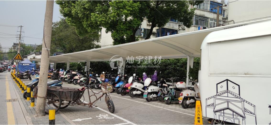 膜結(jié)構(gòu)電動(dòng)自行車充電停車棚CY-MJGZXP01 蘇州燦宇膜結(jié)構(gòu)自行車充電車棚,上面膜結(jié)構(gòu)耐用美觀,下面帶智能充電樁,掃碼支付,充滿電自動(dòng)斷電,簡(jiǎn)單方便防火。